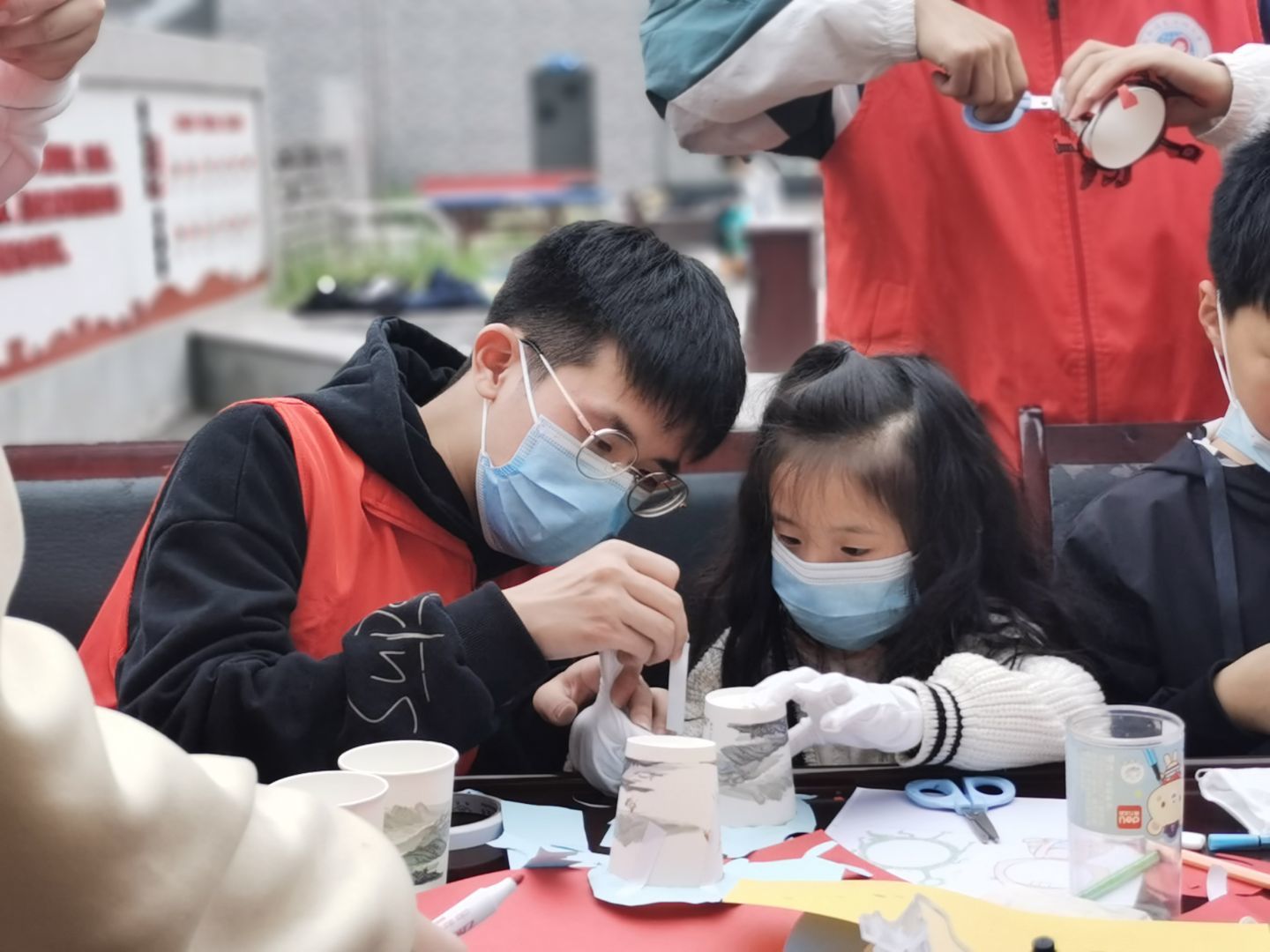 本次“防疫情,展未来”的活动在苏码头社区展开,志愿者在下午两点三十分到达社区开展本次活动。首先,由志愿者带领了小朋友做了剪纸活动,用两至三张卡纸分别做了口罩、病毒和人偶的模型,并将病毒套在纸杯上,通过有弹性的手套将病毒模型做成能发射“细菌”的小玩具去攻击人偶,小朋友们则需要给人偶戴上做好的口罩来抵御病毒。第二个游戏叫做击鼓传“毒”,被病毒选中的小朋友需要识别志愿者们的表演的是否卫生。第三个游戏则由志愿者先让小朋友学会七步洗手法,再让小朋友独立表演。游戏过程中,志愿者们一对一的引导小朋友,充分调动了小朋友们的积极性,现场充满了小朋友们的欢声笑语。