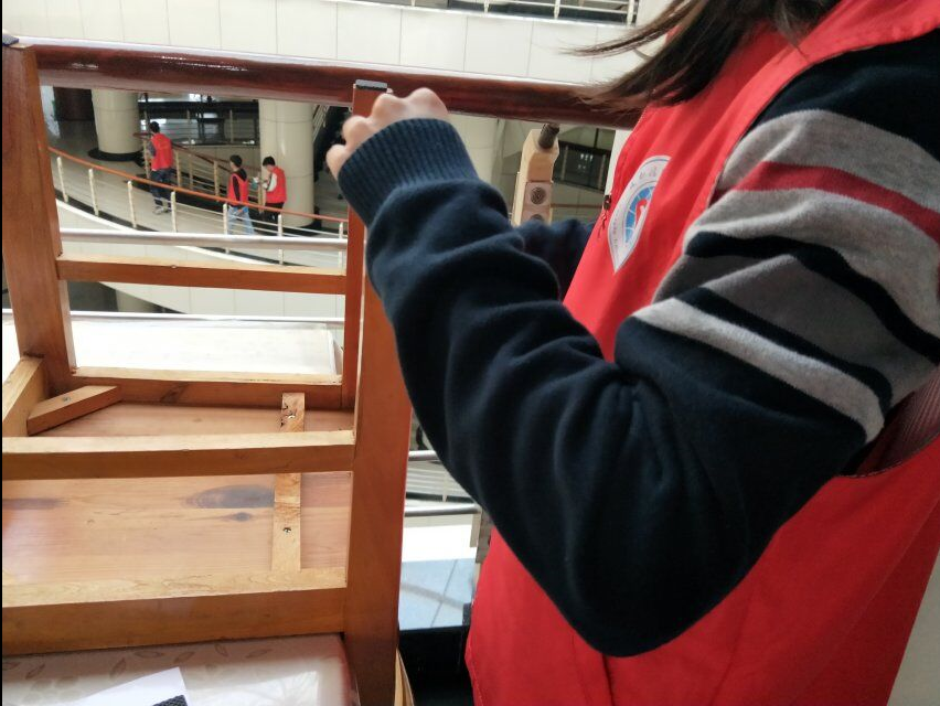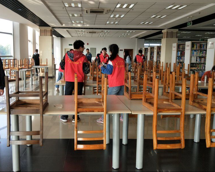 位于航空港校区美丽的图书馆,拥有海量的图书资料,它本是各位同学认真钻研学业的圣地,但同学们却苦于椅子拖动所造成的噪音,影响同学们学习。志愿者们为帮助图书馆同学们们解决了这个问题,早上八点,在很多同学还在吃早饭时,志愿者们已准备好进入图书馆内,为椅脚装备消音贴。各分会志愿者们分楼层,按小组行动,以尽量安静、迅速为目标,顺利地完成了任务。图书馆管理员们对志愿者所做的工作给予了肯定。