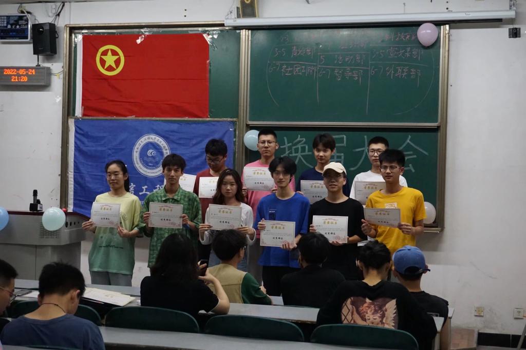 会议上,首先由下一届学生会主席团成员上台做自我介绍,送上美好的祝福,希望学生会继续努力,再创辉煌。随后对2021-2022年度优秀干事和部长进行了表彰,感谢这一年里的辛苦付出。下一届的部门负责人也上台做了自我介绍,大家互相熟识,以便今后工作的开展。