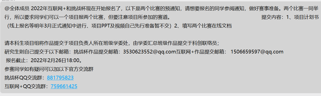 在前期赛事负责人通过线上线下相结合方式将赛事信息传达到每个人,争取让每一个想要参赛的同学都不因消息闭塞而错过比赛机会,相关的赛事群会及时的发布任何与比赛相关的信息,做到与大赛消息同时性。