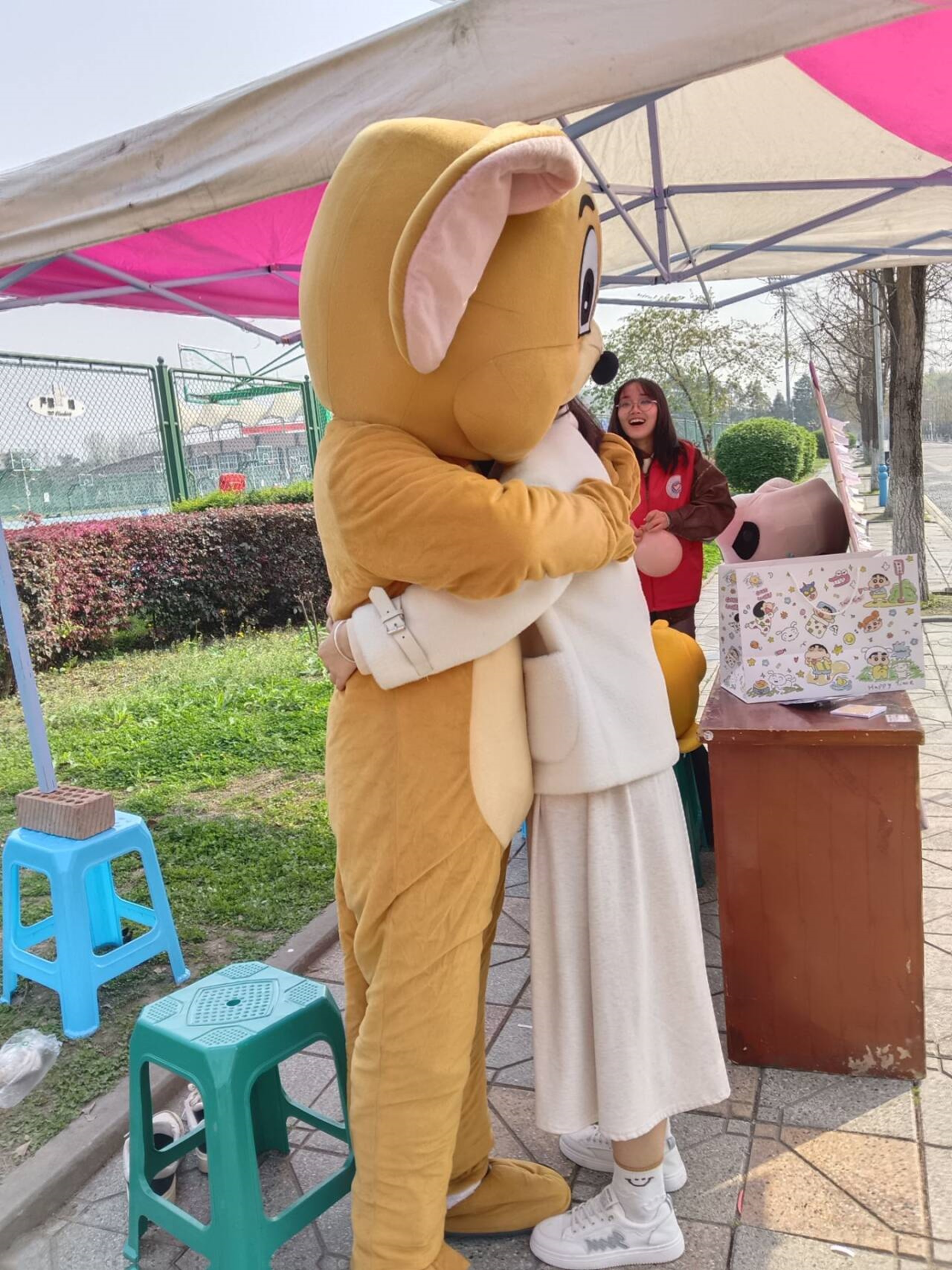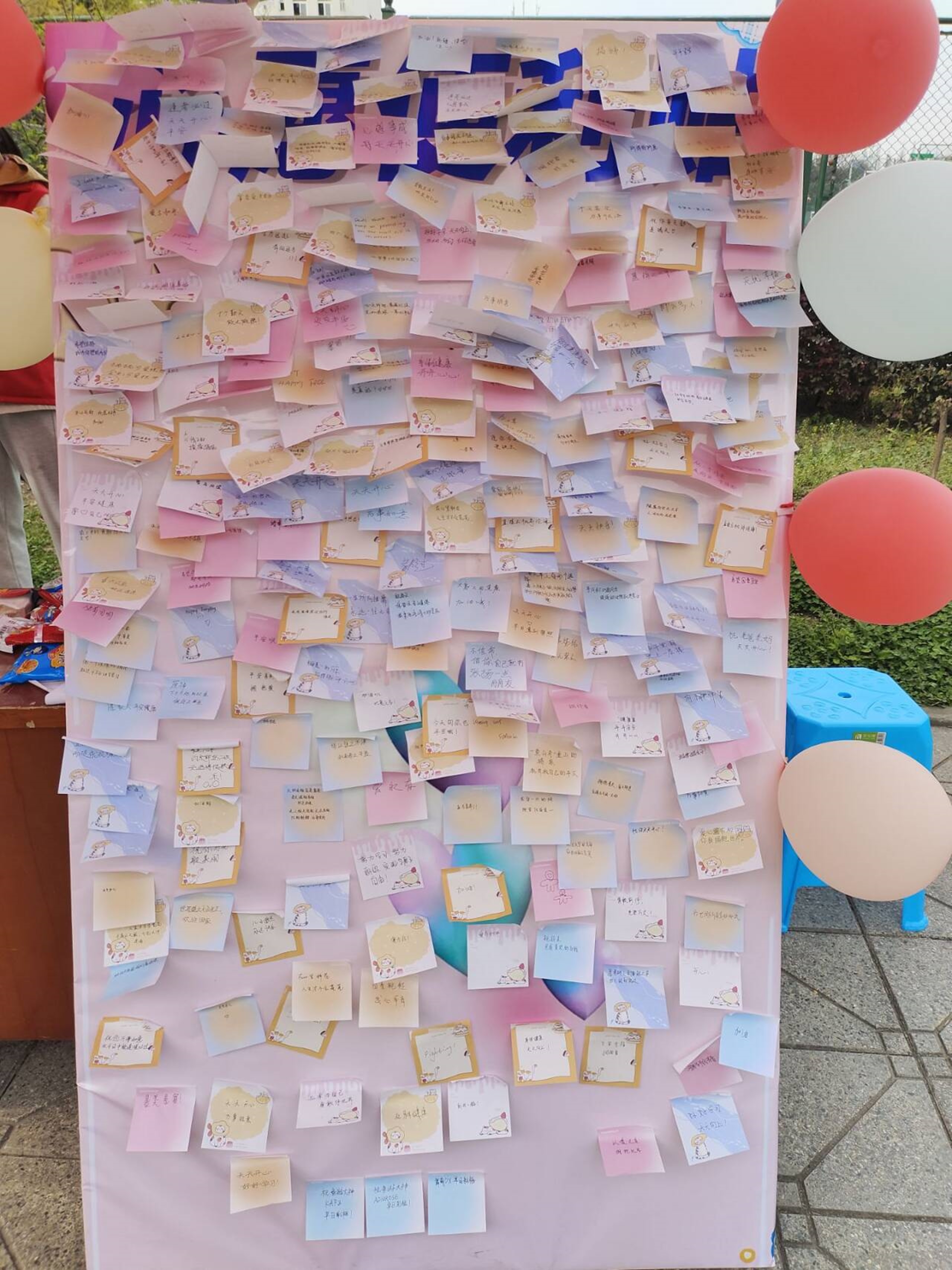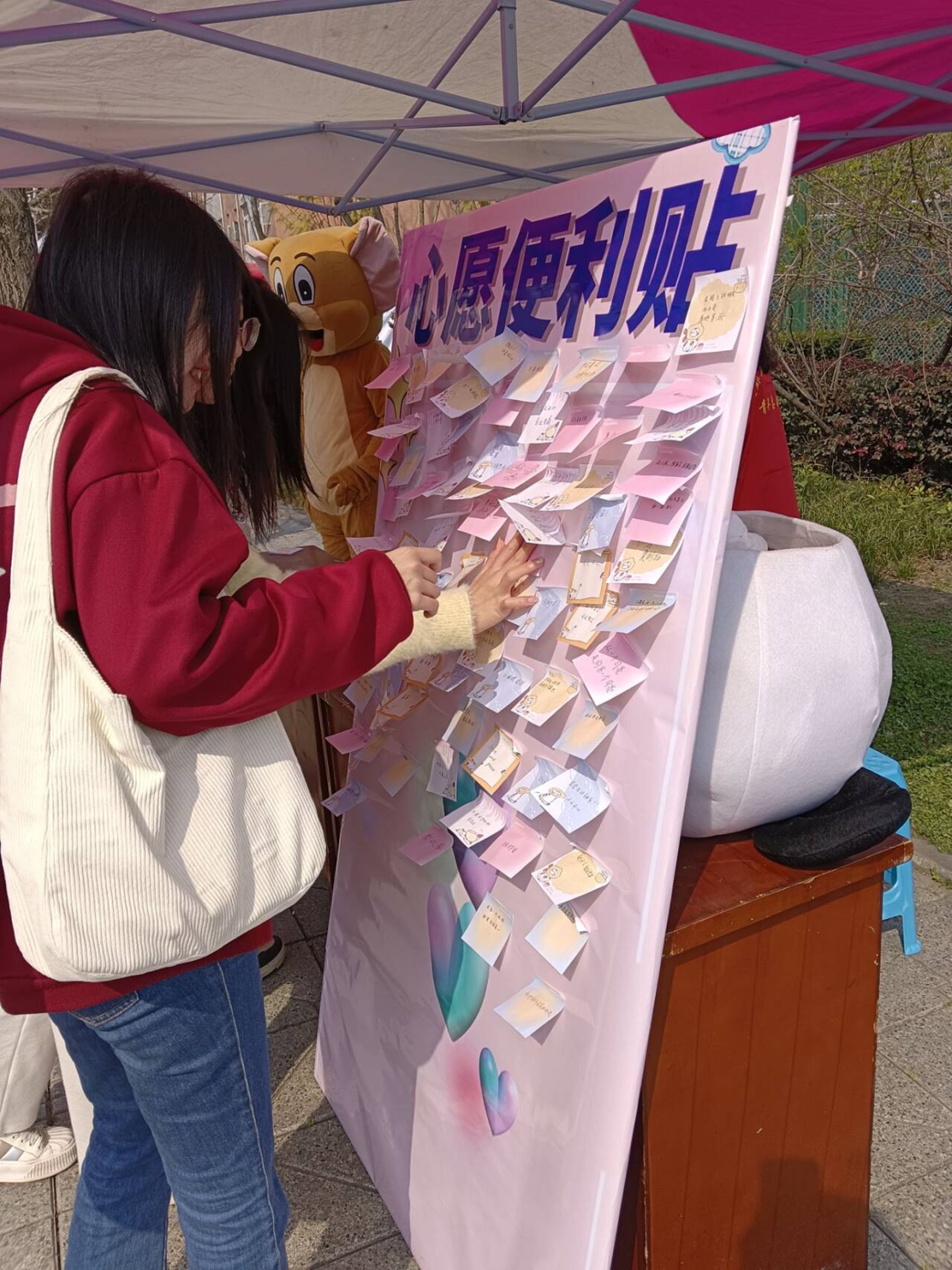 在本次活动中,我们采用了让活动人员在明信片上撰写正能量寄语和与玩偶拥抱互动的方式,活动人员需要在明信片上写出自己对陌生人的鼓励和寄语,同时拿走其他活动人员写的明信片,也可与三个玩偶互动拥抱。活动人员热情满满,收获感动与快乐。志愿者们任劳任怨,始终坚守在自己的点位,给参与的同学提供服务。