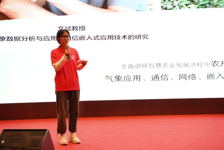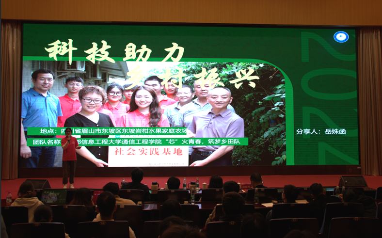 分享会上,实践队队长岳姝函,以饱满的热情和精彩的演讲,生动形象地展示了实践队从队伍组建—深入实践—实践归来的全过程,以“通信+气象”为切入点,展示实践队研发的助农公众号和水肥喷灌系统。用丰富的实践成果和真挚的实践收获,表明青年学子在深入乡村中不断增强的社会责任感和实践本领,更表达了成信学子在广袤乡村中施展才干的决心,赢得了在场观众的热烈掌声。