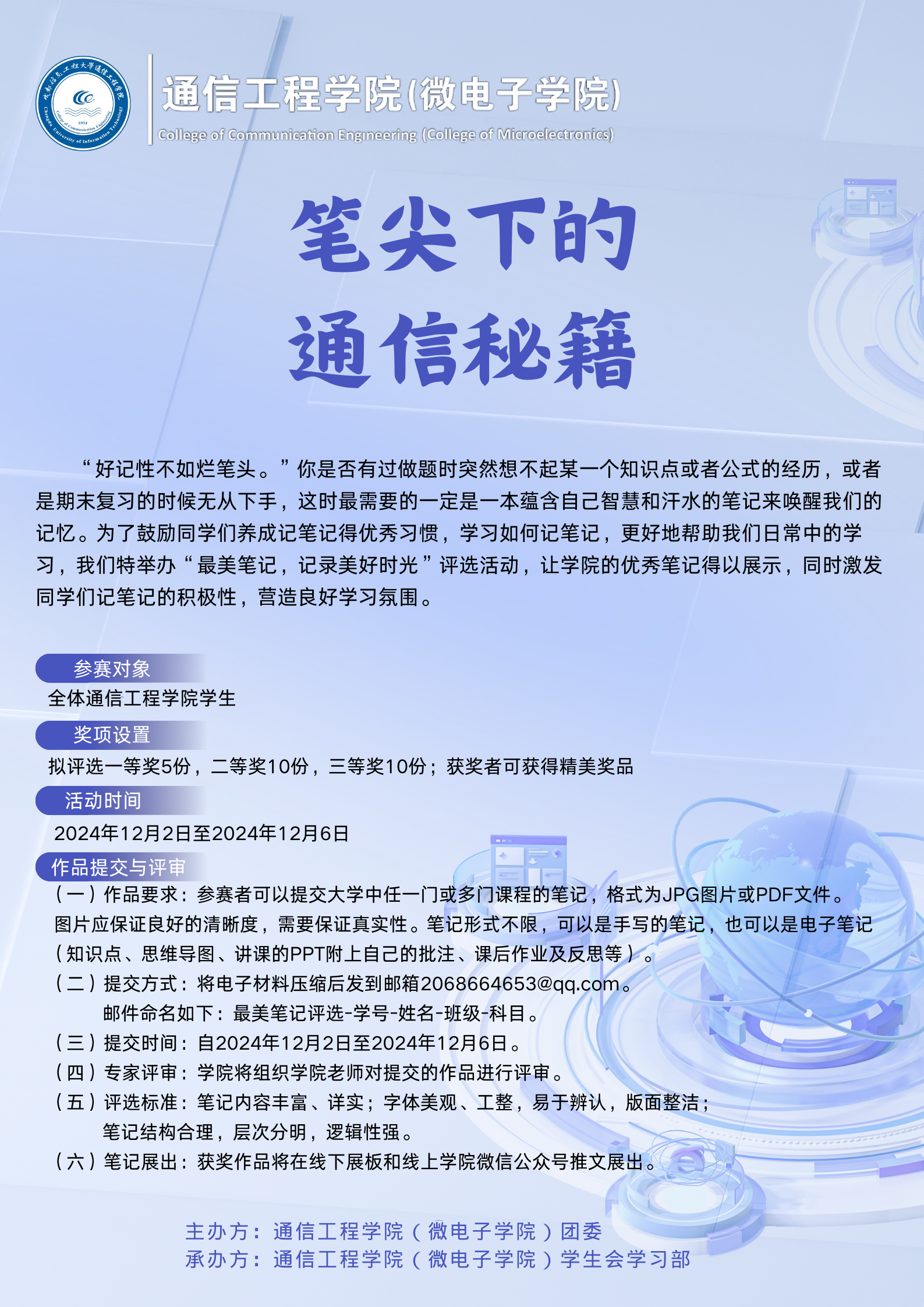 (二)提交方式:自2024年12月2日—12月6日截止。将电子材料压缩后发到邮箱2068664653@qq.com。邮件命名如下:笔尖下的通信秘籍-学号-姓名-班级-科目。(例如:笔尖下的通信秘籍-2018112018-张三-通信241班-高等数学)。若参加多门课程的笔记评比,请对每门课程单独命名。