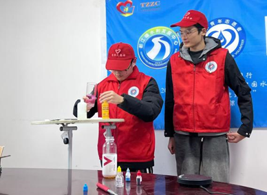 扎了孔的水瓶在瓶盖拧紧的情况下不会漏水?高锰酸钾有哪些神奇的化学反应?趣味课堂上,志愿者刘星雨、白亦康用塑料瓶和带色饮料让小朋友见识到气压的神奇作用;王飞语、庞冰然、龚湘怡让过氧化氢在的催化下分解并与洗洁精反应,产生的彩色绵密泡沫像牙膏一样喷涌而出,让小朋友们眼前一亮;付浩、赖福林将盐酸滴入高锰酸钾溶液,用颜色变化呈现多种化学反应。志愿者们将这些小实验与生活联系,让小朋友们发现科学就在身边、知识就在眼前。