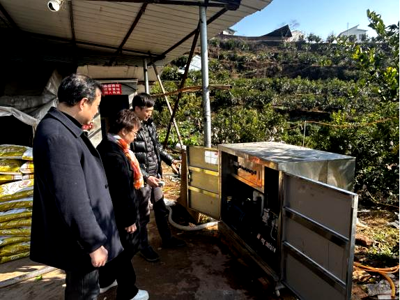 马文英一行率先参观并实验了果园当前投入使用的一体化智能喷灌设备,该设备由学院文斌教授团队开发研究,在2024年暑期三下乡实践中进行实验,已在果园里约十亩柑橘地进行使用。现场双方就设备的技术实现原理、投入使用效率、后期推广可能等具体问题进行深入探讨。