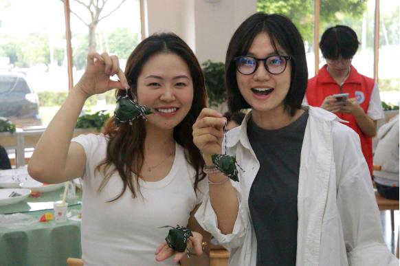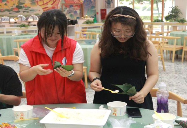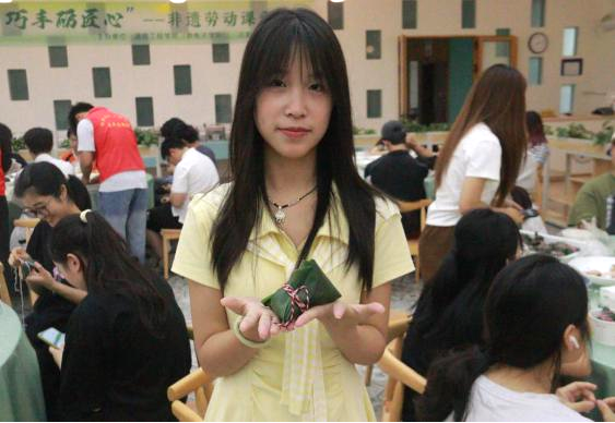 在食堂阿姨和志愿者们的耐心示范指导下,同学们拿起粽叶、折叶、填米、放枣、成形、缠线,亲手包好了自己的专属手工粽,不一会儿,一个个形状各异,却又分外可爱的粽子就呈现在眼前。有小巧的“迷你粽”、多层的“复合粽”、咸甜口感皆能满足。翠绿的粽叶和洁白的糯米在大家手中翻飞,传递着浓浓粽香和满满的温情。