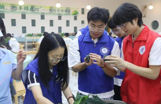 活动现场,平日里为同学们打饭的食堂阿姨,这次化身亲切的“粽子老师”。她麻利地拿起青翠的粽叶,一边演示一边讲解:“叶子要这样窝成小漏斗,米别放太满,绳子要扎紧...”同学们围在阿姨身边,看得仔细,学得认真。