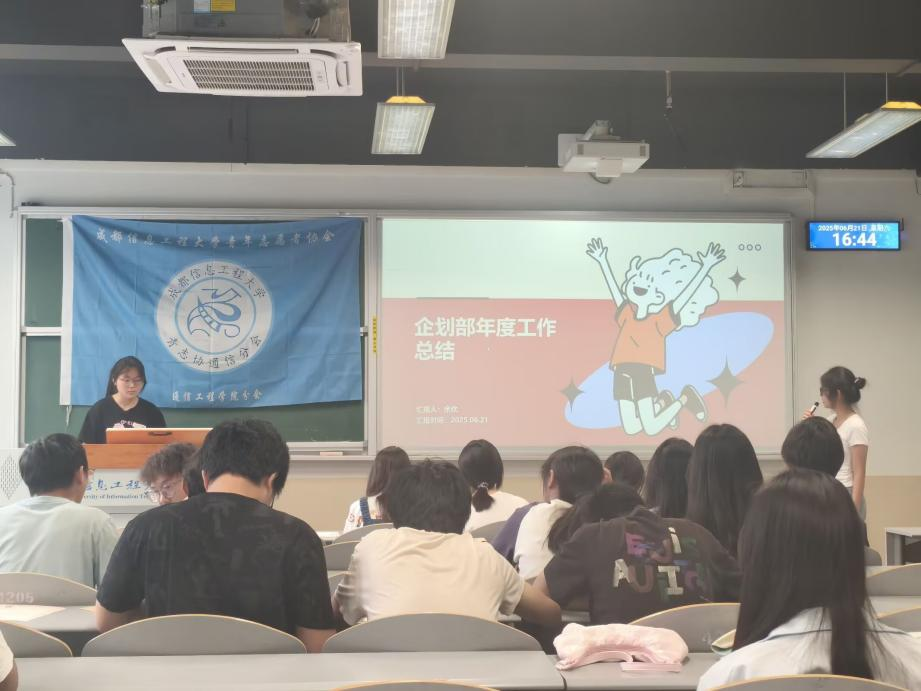 6月22日,成都信息工程大学青年志愿者协会通信分会(以下简称 “青志协”)在航空港教室H4205召开2024-2025学年最后一次例会。本次例会以总结经验、表彰先进为核心,旨在激励全体干事以更饱满的热情投身志愿服务,在社会服务中绽放青春光彩。