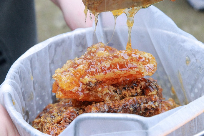 在驻村第一书记陈鹏飞的带领下,实践队深入养蜂农户家,实地体验“古法”蜂蜜酿造,亲自参与从燃烟驱蜂、敲桶取蜂、刮刀割蜂的全过程,同时采用传统的桶压式过滤原蜜,把一罐又一罐“纯天然”蜂蜜封装成罐。在动手实践中感受大自然的馈赠,在团队协作中思考农产品销路的拓展。