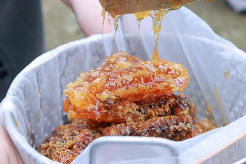 唯有躬身蜂桶旁,方知传统工艺里沉淀的不只是蜜,更是代代相传的匠心与坚守。在驻村第一书记陈鹏飞的带领下,实践队走进养蜂农户家,实地体验“古法”蜂蜜酿造工艺,从“燃烟驱蜂—敲桶取蜂—刮刀割蜜”全过程参与。用传统的桶压式物理过滤法提取原蜜,一罐罐手工封装的纯天然蜂蜜,代表了黑沟村大自然最原始的馈赠。