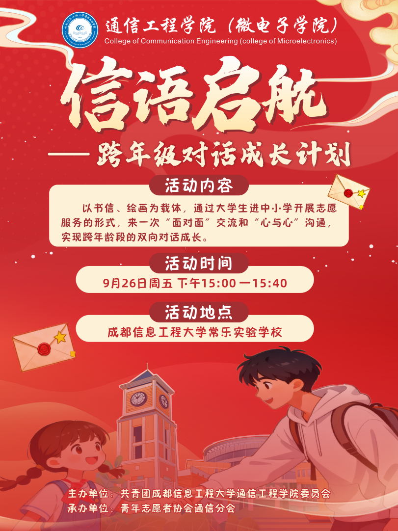以笔为舟,以信为岸,赴约未来。为引导同学树立学习目标、制定成长计划。9月25日至26日,学院青年志愿者协会通信分会组织开展了“信语启航、赴约未来”——时光邮寄活动。此次活动面向全校同学,联动成都信息工程大学常乐实验学校,通过校内线下摆点、校外进中学的形式,开展了一场跨年级、跨校区的成长对话。