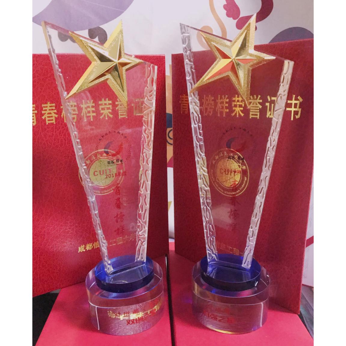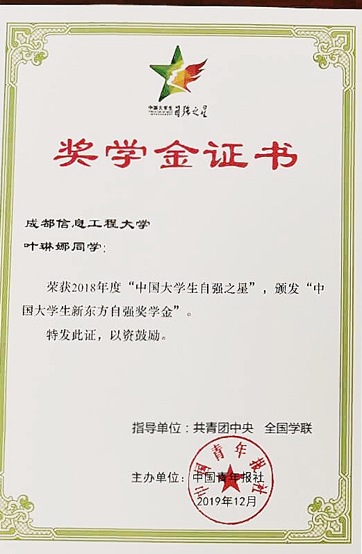 先后获得2019年四川省优秀毕业生、2019年度中国大学生自强之星、2019年度成都信息工程大学青春榜样“自强之星”、2019年度成都信息工程大学青春榜样“双创之星”、国家励志奖学金等奖项及称号。连续三年获得一等奖学金,被授予成都信息工程大学“三好学生”、“优秀学生干部”、“优秀团学干部”等荣誉称号。