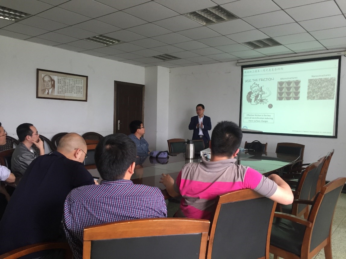 张晓升教授做了题为“面向单片全集成自驱动穿戴式微系统的微能源采集技术”的学术讲座。张晓升教授就微纳复合制造、新型微能源采集、自供能柔性微系统等领域进行了全面的介绍,分析了当前学科发展的现状及趋势。张晓升教授着重介绍了自己团队所取得的一系列成果,并现场展示了一系列利用微能源采集技术实现的小器件,包括使用蚕丝蛋白制作的摩擦生电薄膜,使用纤维素制作的自生电可穿戴衣物材料,以及使用石墨和纸张制作的电供能系统等。随后,张晓升教授与在场的师生们就纳米制造及微能源采集技术这一新兴前沿学科的发展和应用趋势进行了探讨。