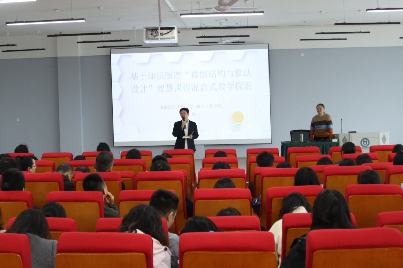 为加快课堂教学改革,引导全体教师利用现代技术推动教学模式优化,提高教师信息素养和教学水平,助推混合式教学公开课活动有效开展,11月13日,德阳科贸职业学院邀请我院张敏老师在该校南校区阶梯教室602开展了基于知识图谱“数据结构与算法设计”智慧课程混合式教学探索主题讲座,张敏老师为主讲人。德阳科贸职业学院副校长冯鸿、校长助理徐琳以及全体任课教师参加。