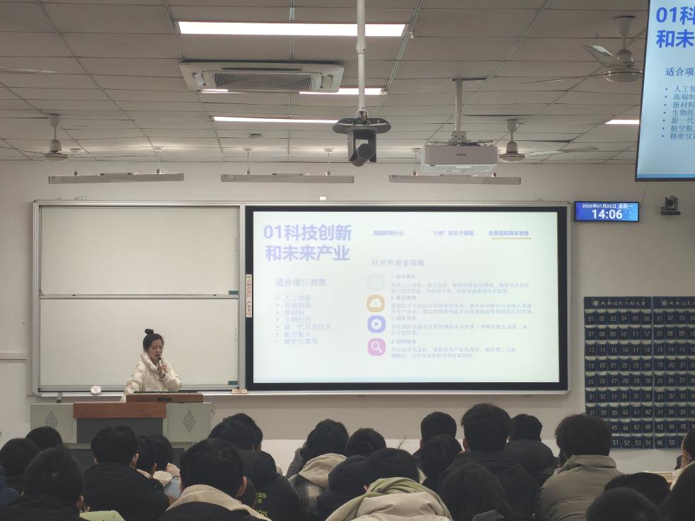 为激发学生创新创业热情,提前了解竞赛要点,科学规划备赛路径。1月5日,学院于H2106教室开展2026年度“挑战杯”大学生创业计划竞赛宣讲会,特邀校团委副书记尹欣、电子工程学院(大气探测学院)吴昊副教授作为主讲嘉宾。学院团委书记盛小芳主持,全院150余名备赛团队成员现场聆听学习。