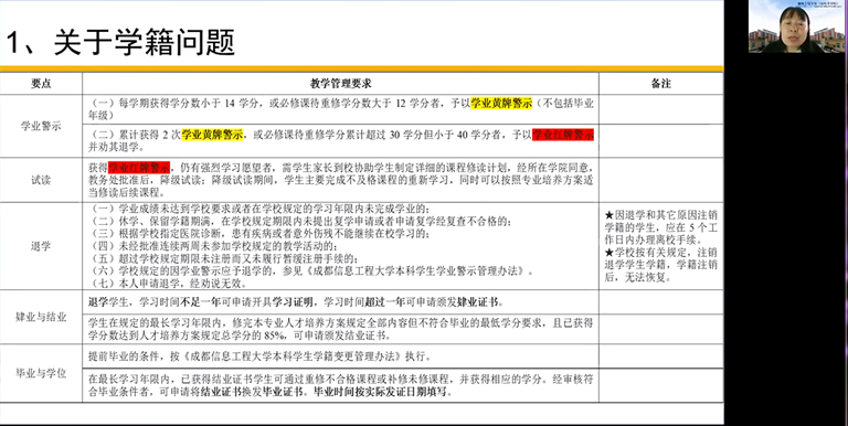 为了尽快让新生熟悉我校教学管理制度,了解学籍学分等相关细则,做好自身学习规划。9月17号上午9点,betway必威西汉姆联在腾讯会议上开展教学管理制度与规范讲座,此次讲座由学院党委副书记、副院长薛雅娟组织开讲,2022级全体同学参与。