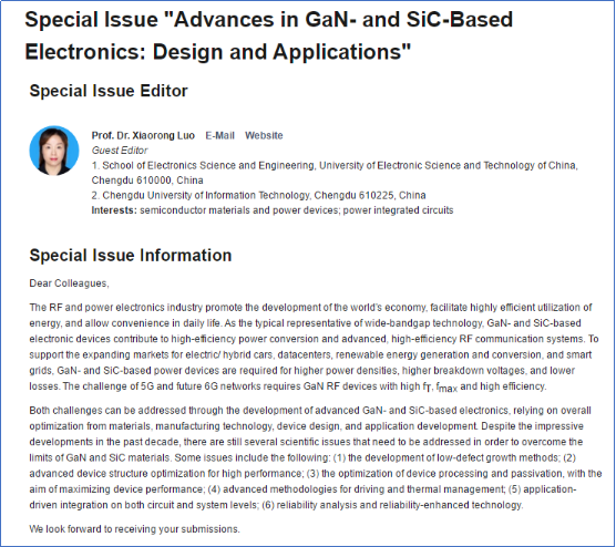 罗小蓉教授受邀担任Micromachines”期刊的专刊“Advances in GaN- and SiC-Based Electronics: Design and Applications”编辑
