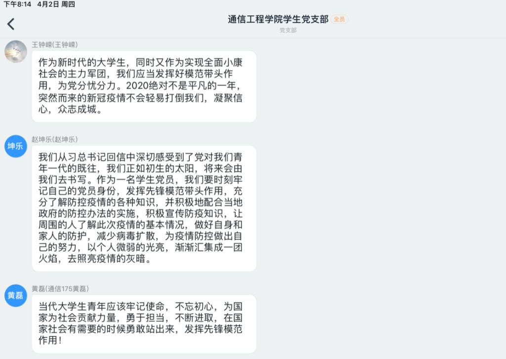 在抗击新冠肺炎疫情的关键时刻,3月15日,习近平总书记给北京大学援鄂医疗队全体“90后”党员回信,向他们及奋战在一线的广大疫情防控人员致以亲切问候,并寄语广大青年不惧风雨、勇挑重担,“让青春在党和人民最需要的地方绽放绚丽之花”。4月2日20:00,通信工程学院“学习重要精神,践行党员使命”主题会议顺利开展。