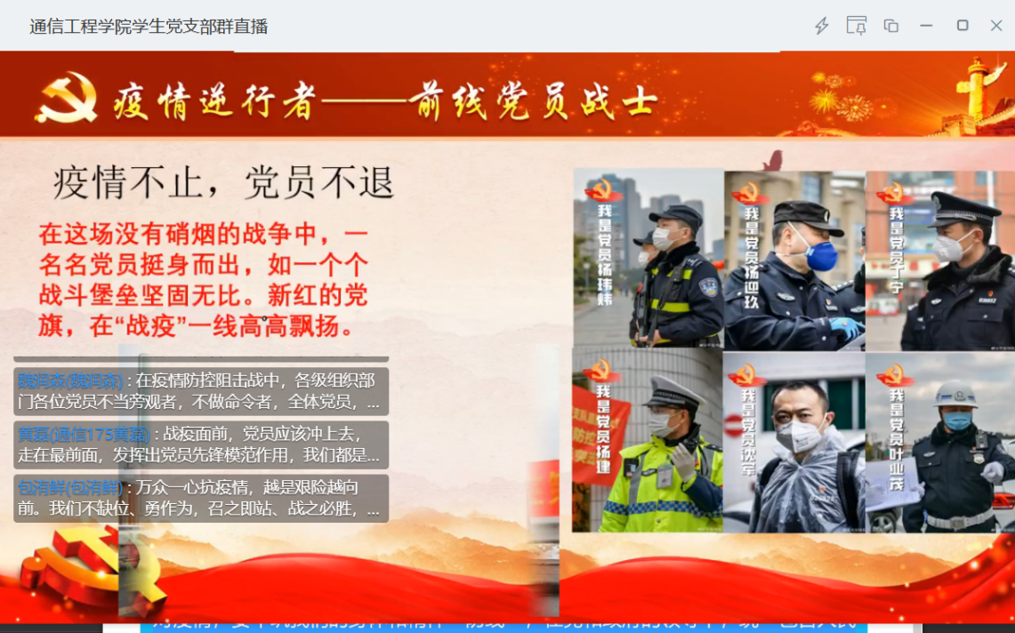 本次活动的内容为观看防疫宣传片、习近平总书记讲话以及学习疫情防控知识。在活动过程中,孙敬同志强调:共产党员在疫情防控的关键时刻,必须提高自己的政治站位,提升政治意识,明确政治立场。每位党员同志必须有思辨意识,做到不信谣、不传谣,勇于同谣言、恶势力作斗争,弘扬社会正气,积极传递社会正能量。学习过程中,全体党员同志对此次疫情进行讨论,卜佳雨同志表示:“我们要牢记‘万众一心抗疫情、越是艰险越向前’,不缺位、勇作为,召之即战、战之必胜,坚决打赢抗击新型冠状病毒无硝烟之战。”
