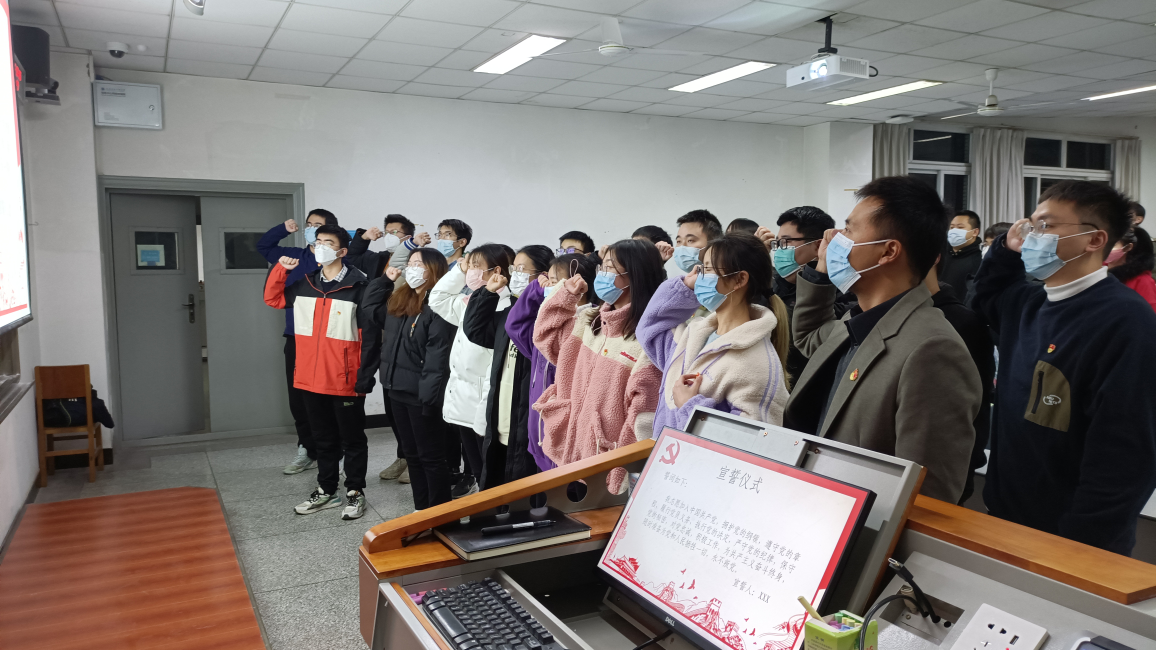 会议伊始,党的发展对象依次围绕对党的认识和入党动机进行阐述,并汇报了自己在考察期内的表现及主要优缺点,表示始终以党员的标准严格要求自己,从思想建设落实到实际行动,表达了为共产主义奋斗终身的决心。每一位同志发言结束后,各入党介绍人分别对发展对象在考察期内的表现进行了介绍,并向大会汇报了发展同学的培养、教育、考察情况。经过支部大会认真考察并结合每位发展对象表现情况,全体正式党员投票表决,决定将周少俊、牟依涵等32名同志发展为预备党员。最后,新党员同志佩戴党员徽章,刘书记领誓,全体党员同志庄重地宣誓入党誓词。