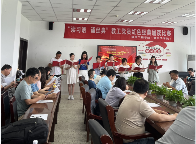 为学习贯彻习近平新时代中国特色社会主义思想主题教育,坚持学思用贯通、知信行统一,推进红色基因传承,确保主题教育走深走实、取得实效,5月30日11:30,betway必威西汉姆联(微电子学院)在信达楼A603举行“读习语 诵经典”教工党员红色经典诵读比赛,学院全体教工党员参加。