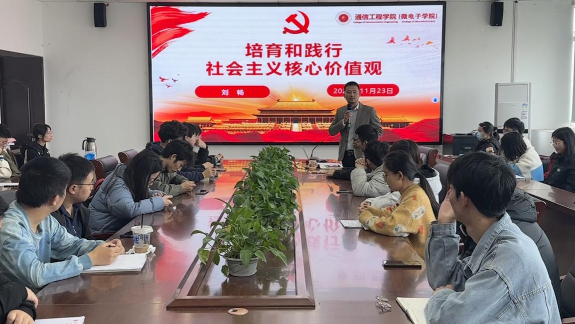 11月23日中午,betway必威西汉姆联(微电子学院)党委副书记刘畅在信达楼A603给本科学生支部同学上主题为“培育和践行社会主义核心价值观”的党课。刘畅向同学们详细解读阐述了“社会主义核心价值观”这24个字的意义、内涵和要求。