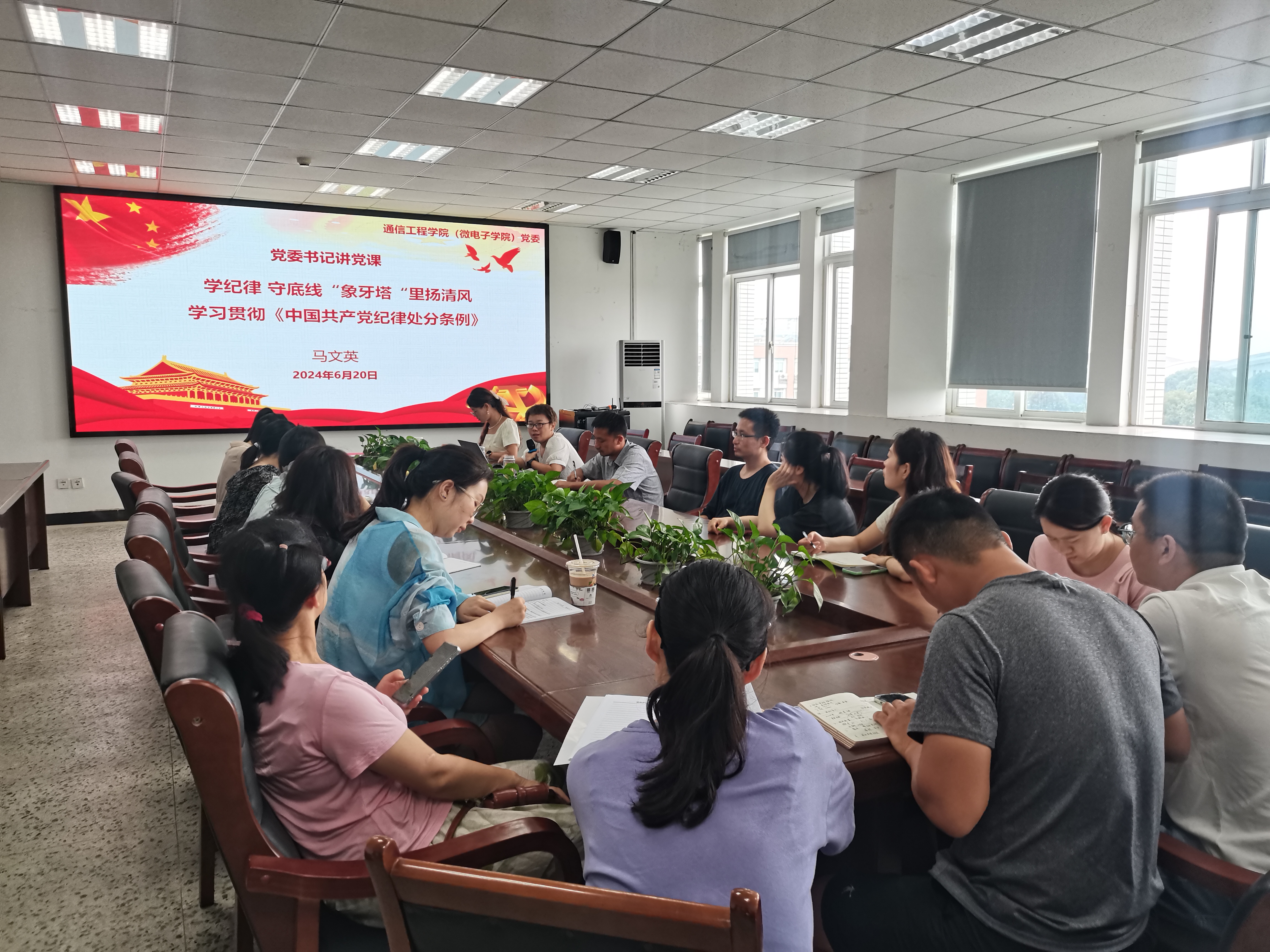 “七一”建党节临近,为庆祝中国共产党成立103周年,扎实推进党纪学习教育走深走实,引导党员教师增强纪律意识,严守纪律红线,6月20日,betway必威西汉姆联(微电子学院)党委书记马文英以《学纪律 守底线 “象牙塔“里扬清风 学习贯彻<中国共产党纪律处分条例>》为题,在信达楼A603会议室为学院微电子教研室党支部、集成电路教研室党支部、行政党支部的党员教师讲授党纪学习教育专题党课。
